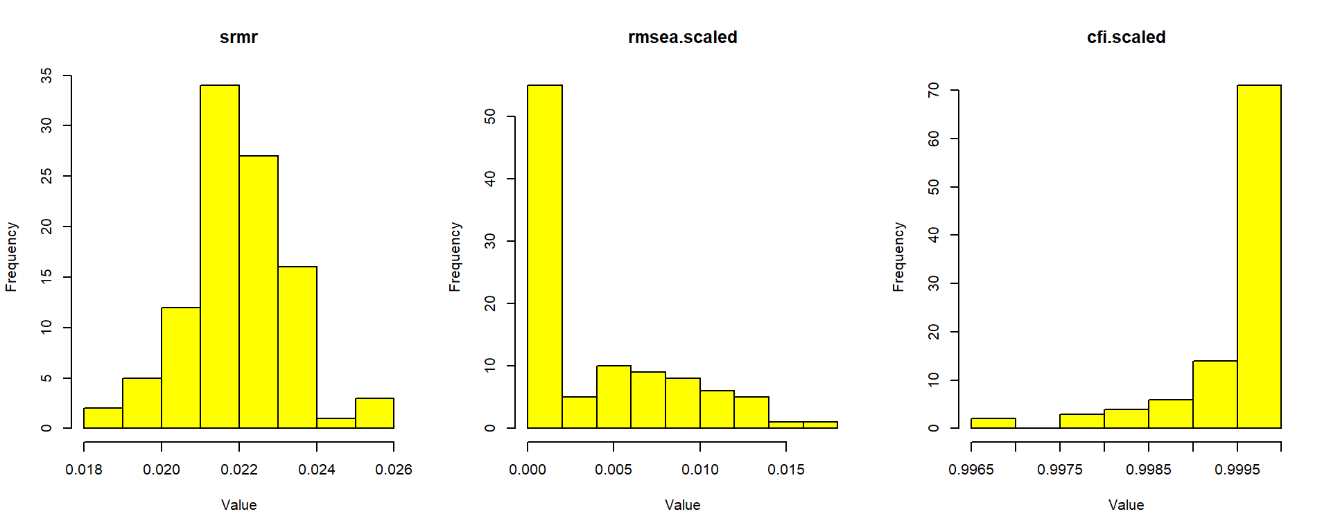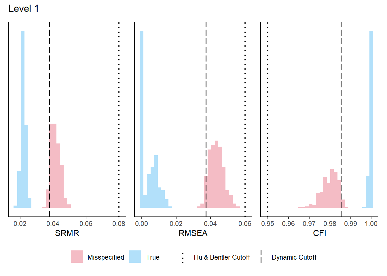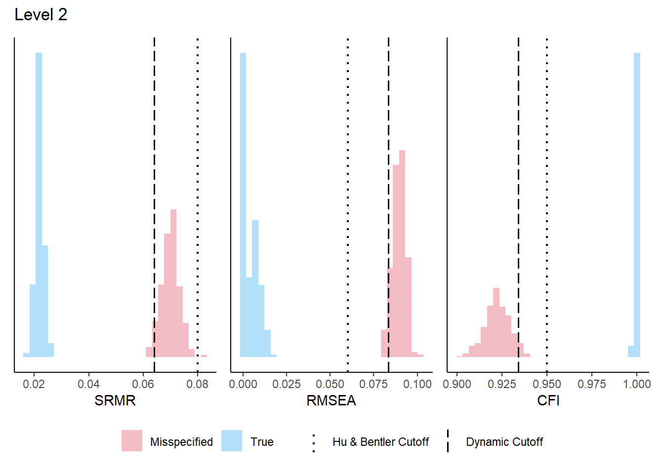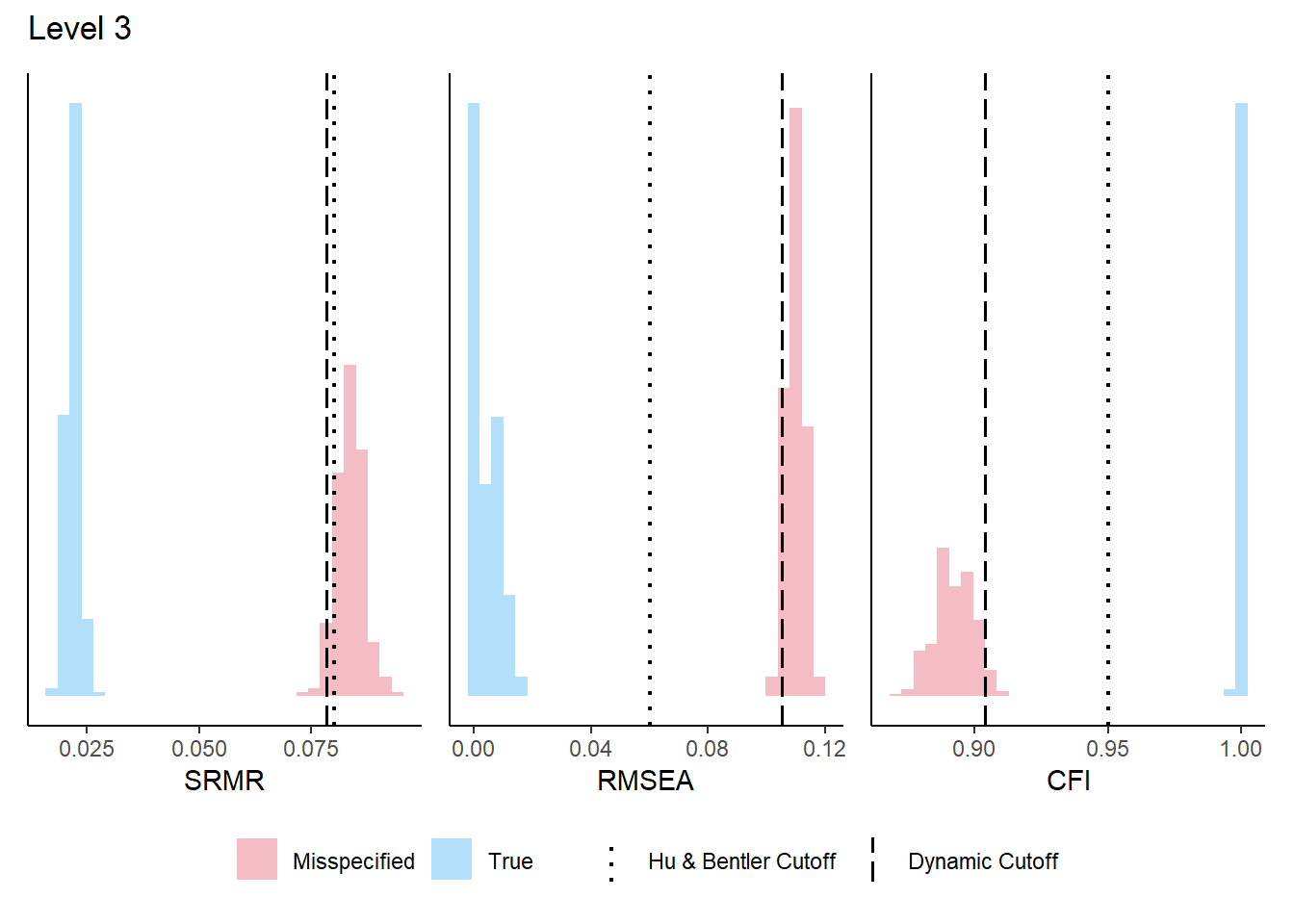 Figure 9 shows the empirical distributions of SRMR, RMSEA, and CFI across 100 replications, with rule-of-thumb cutoffs overlaid as vertical lines. The distributions should be concentrated well below (SRMR, RMSEA) or above (CFI) the cutoffs.