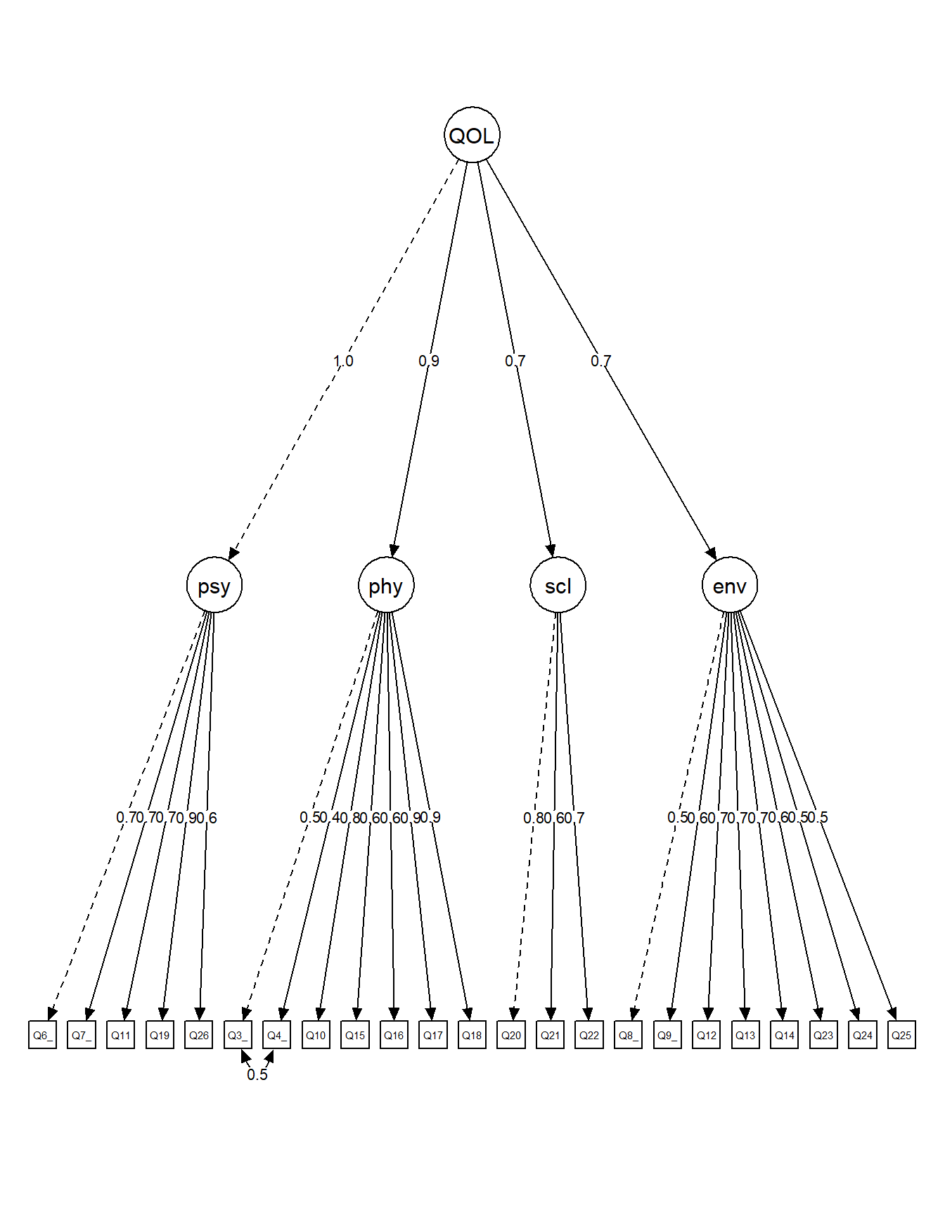 Each of the 24 items loads on exactly one of the four latent factors: Psychological (6 items), Physical (7 items), Social (3 items), and Environment (8 items). Latent factors are allowed to freely correlate, reflecting the expected interrelations among quality of life domains. A residual covariance between items Q3 and Q4 is included based on prior theoretical and empirical evidence, as both items assess related aspects within the Physical domain.