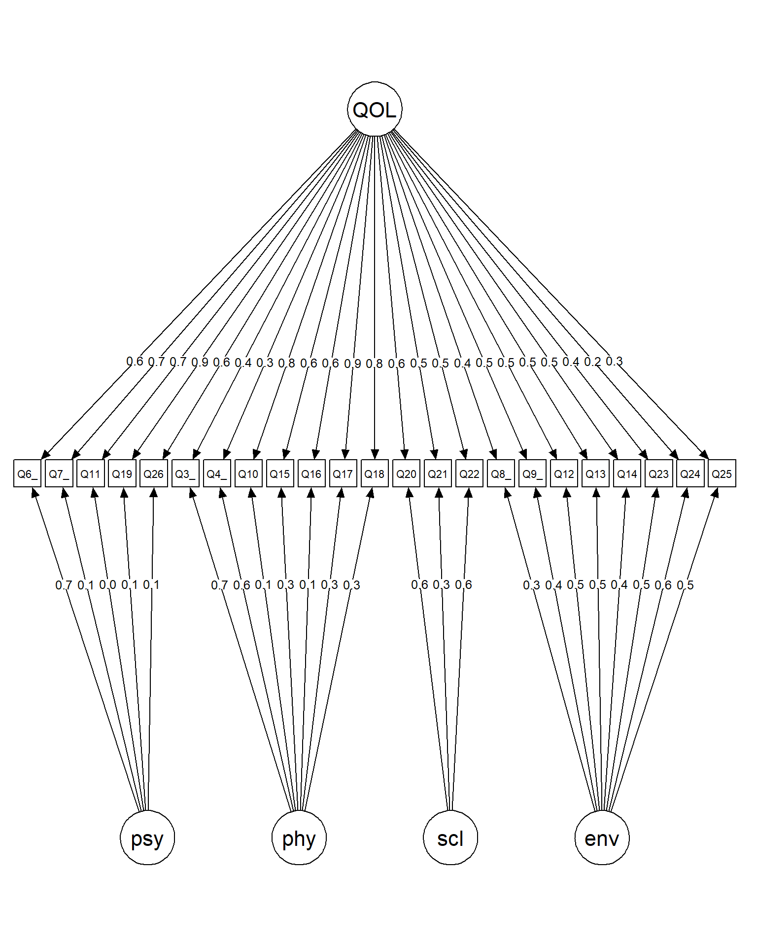 The population model is based on the meta-analytic factor loadings from Lin & Yao (2022), who validated the WHOQOL-BREF factor structure using a meta-analysis of exploratory factor analyses combined with social network analysis. Factor correlations were set at 0.3, reflecting the upper bound reported in Lin & Yao (2022) (range 0.08–0.30). Residual variances were derived analytically as 1 − λ² (except for Q3 and Q4, whose residuals are adjusted for their predicted correlation).
